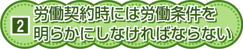 ◆労働契約とは、労働者と使用者との間で交わされる労働条件その他に関する契約です。契約に際し、使用者は労働者に対して労働条件を明らかにしなければなりません。(労働基準法第15条)